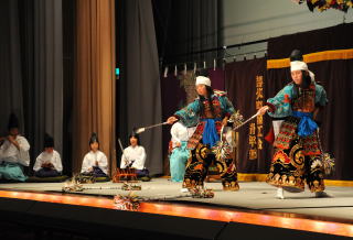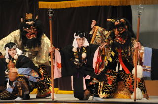 | 「玉藻の前」 上石子供神楽会 | (団体プロフィール) 神楽に関心のある小4〜6年生までの9人で、平成2年に発足。今年は小3〜高校生まで13人で活動。 |